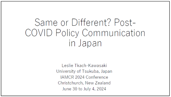 日本財団 中央アジア・日本人材育成プロジェクト(NipCA)のご支援により、筑波大学NipCAフェロー指導教員のタック川﨑レスリー教授が、2024年6月30日(日)から7月4日(木)にニュージーランドのクライストチャーチで開催された国際メディア・コミュニケーション研究学会(IAMCR)2024年次大会に参加し、発表を行いました。