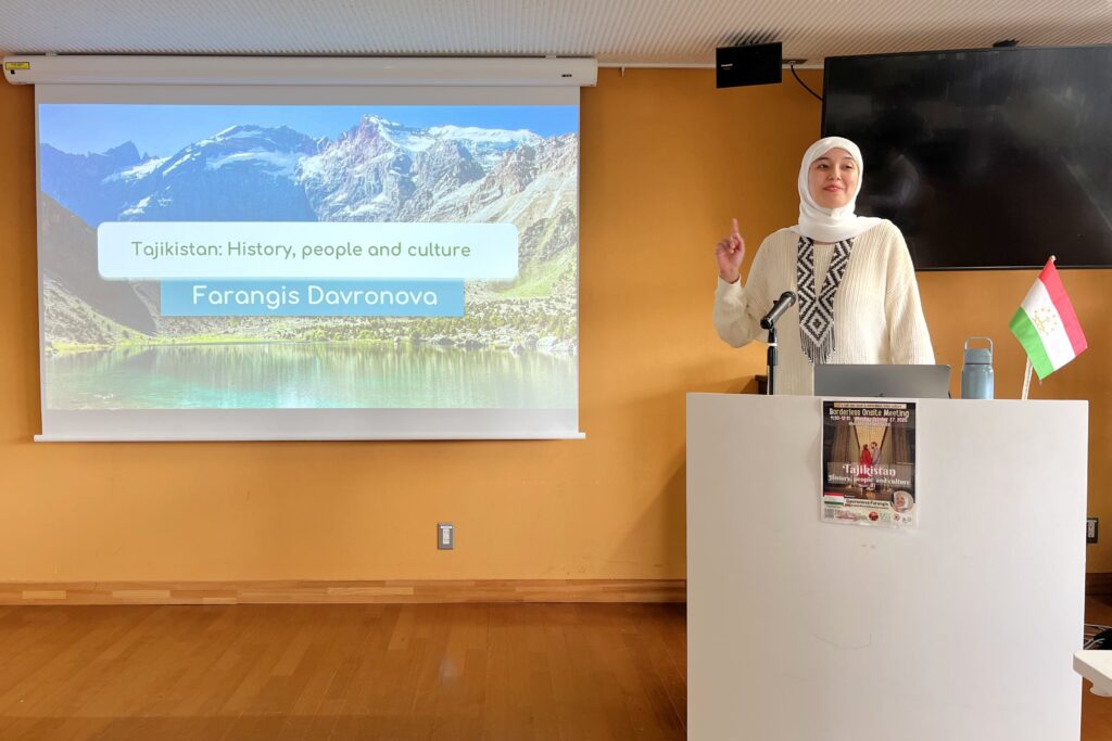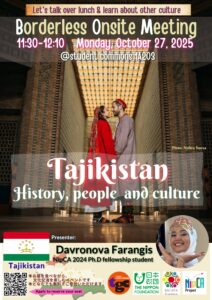 2025年10月27日(月)、第16回Borderless Onsite Meetingを開催しました。今回は、NipCAフェロー6期生で国際公共政策博士後期課程のファランギス・ダヴロノヴァさんが「タジキスタン:歴史、民族、文化」というテーマで魅力的なプレゼンテーションを行いました。ファランギスさんは、豊富な映像と語りをとおして、参加者たちをタジキスタンの世界へと引き込みました。そこは、ペルシアの伝統やイスラム文化、そしてソ連時代の歴史が、風景や言語、日々の暮らしの中で重なり合っている国です。