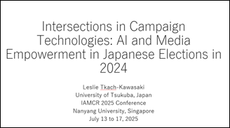 タック川﨑先生は大会の最終日である7月17日に、「キャンペーン技術の交差点:2024年日本の選挙におけるAIとメディア・エンパワーメント」という題目で論文を発表しました。2024年は、日本におけるオンライン選挙活動にとって非常に注目すべき年でした。個人によるソーシャルメディア上で政治キャンペーン動画を再制作・再投稿する動きが注目を集めただけでなく、従来の選挙ポスターなどの選挙メディア資源の利用方法も個々の人によって新たな取り組みが加えられました。さらに、日本の政党や候補者もオンラインキャンペーンにおいてますます巧みになり、2024年は日本のオンライン選挙運動の進化において特筆すべき時期となりました。