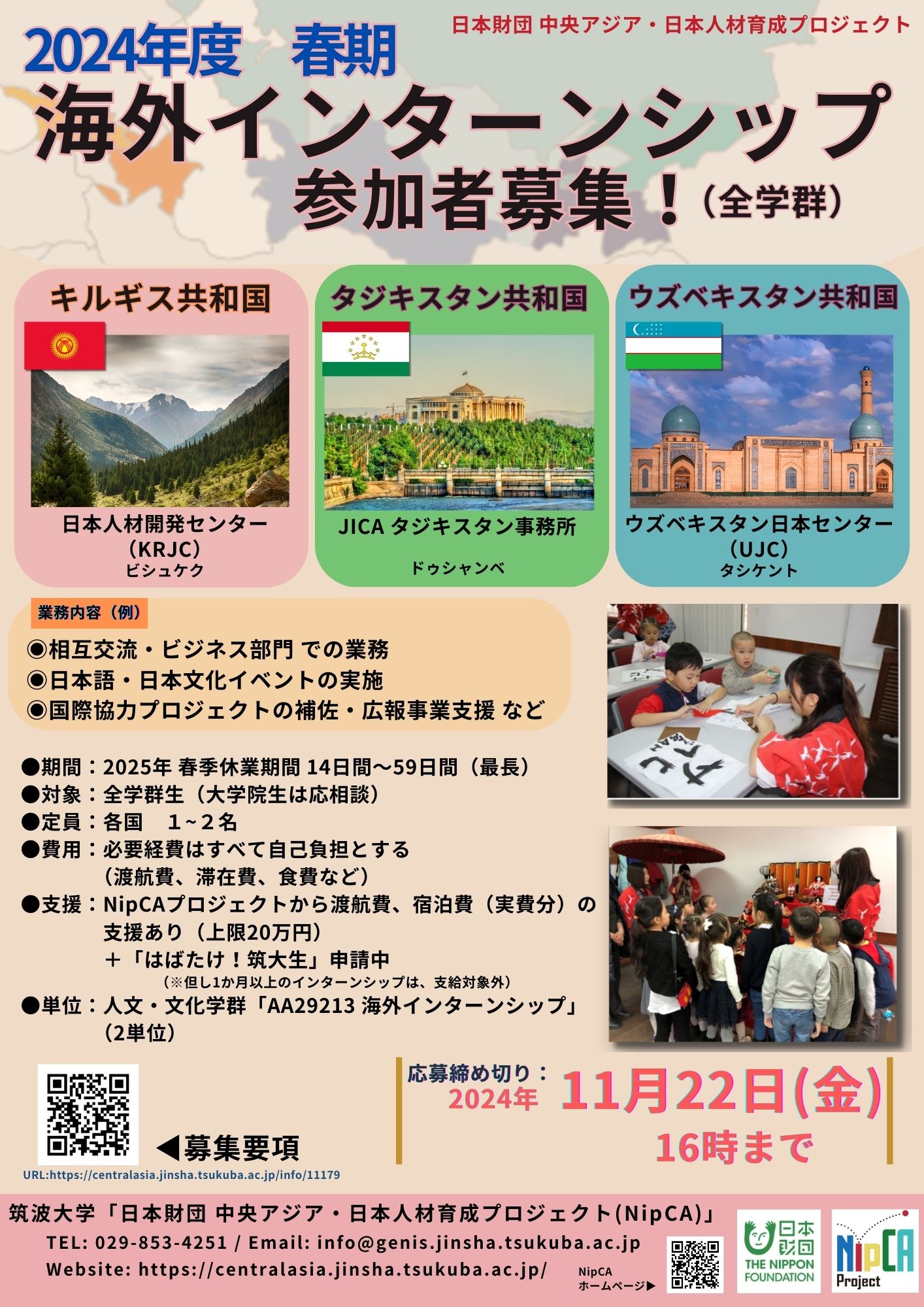 25年春季に、キルギス共和国日本人材開発センター(KRJC)(キルギス共和国)とJICAタジキスタン事務所(タジキスタン共和国)で、海外インターンシップが実施され、本学学群から各国1名ずつ参加しました。