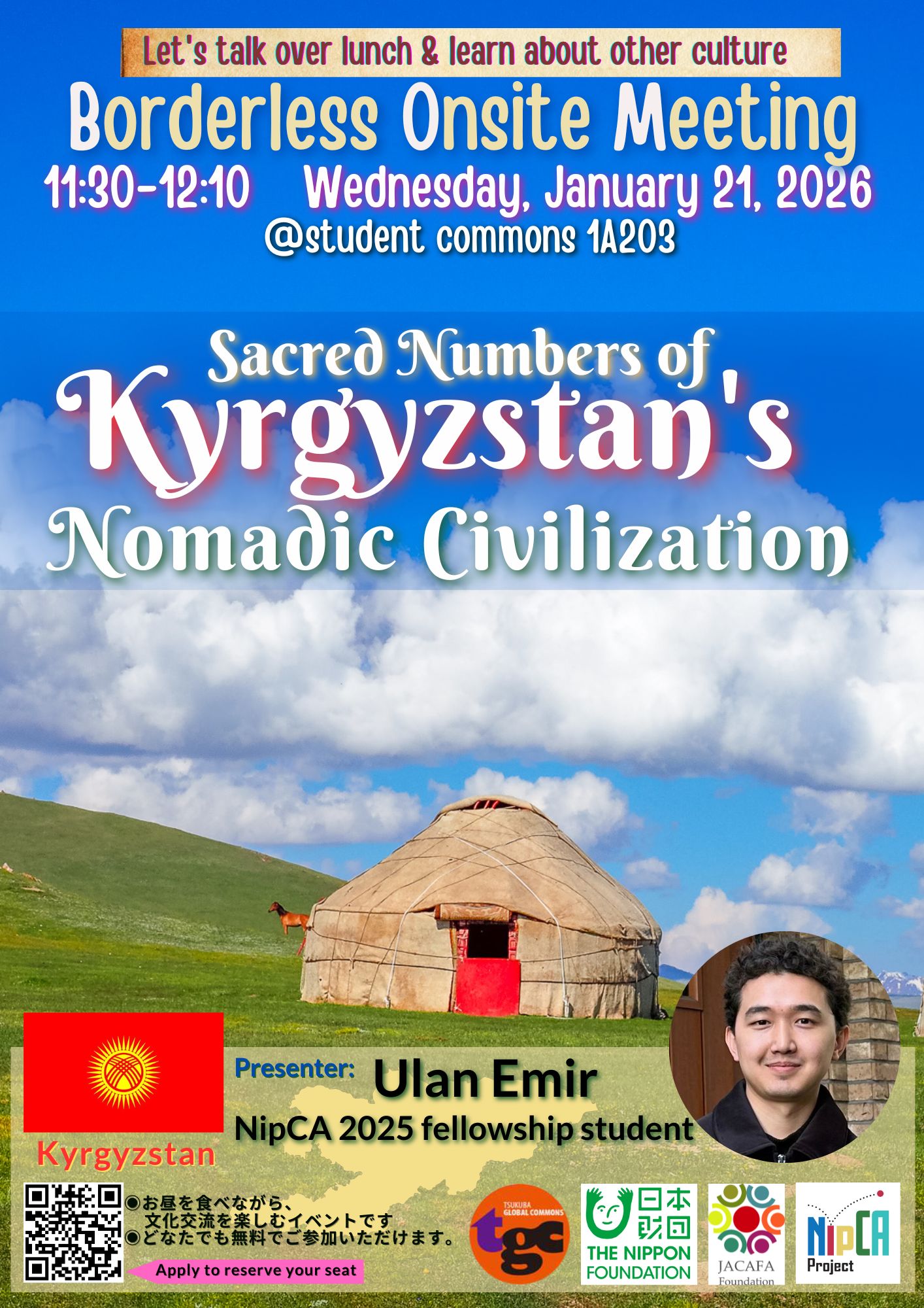 17回目となる今回は、NipCA フェロー2025のウラン・エミールさん(キルギス共和国)が、母国で使用される象徴的な数字にフォーカスしながら、キルギス文化ついて紹介してくれます。(例えば、キルギスでは日本と同様、4や9の数字は避け、7は歓迎すべき数字として使われるようです。)