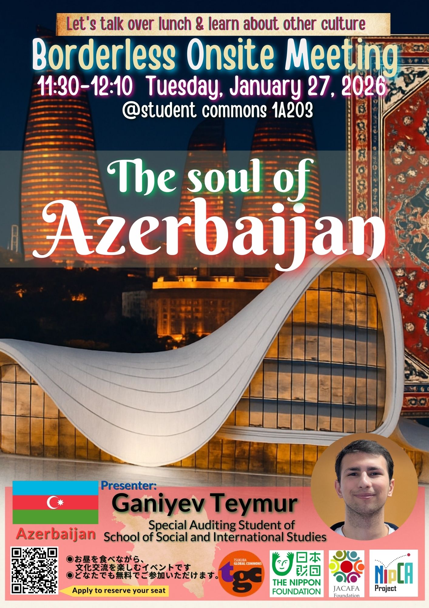 今年度最後のBOMでは、アゼルバイジャン共和国出身の ガニエフ・テイムルさん(特別聴講学生/社会・国際学群国際総合学類)が、アゼルバイジャンの文化を紹介してくれます。