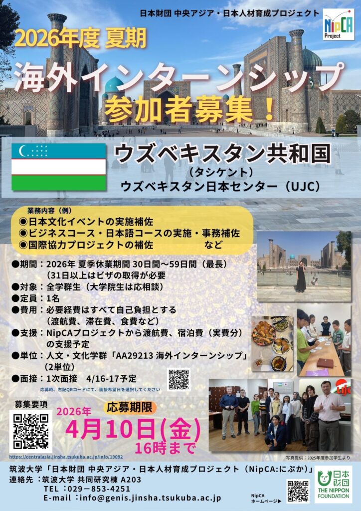本プロジェクトが企画した、中央アジア・コーカサス地方への留学・研修、インターンシップに参加した学生は、NipCA フレンドシップメンバーとして登録され、独自奨学金制度で本学に受けいれている留学生のチューターの紹介や、交流促進に資する様々なイベントに優先的に参加することができます。