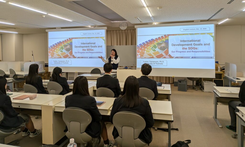 NipCAプロジェクトの教員である山本祐規子准教授が、地元の高校生を対象にSDGsに関する英語講義を行いました。これは、筑波大学の社会貢献活動の一環として行われたもので、2022年度より実施しています。
